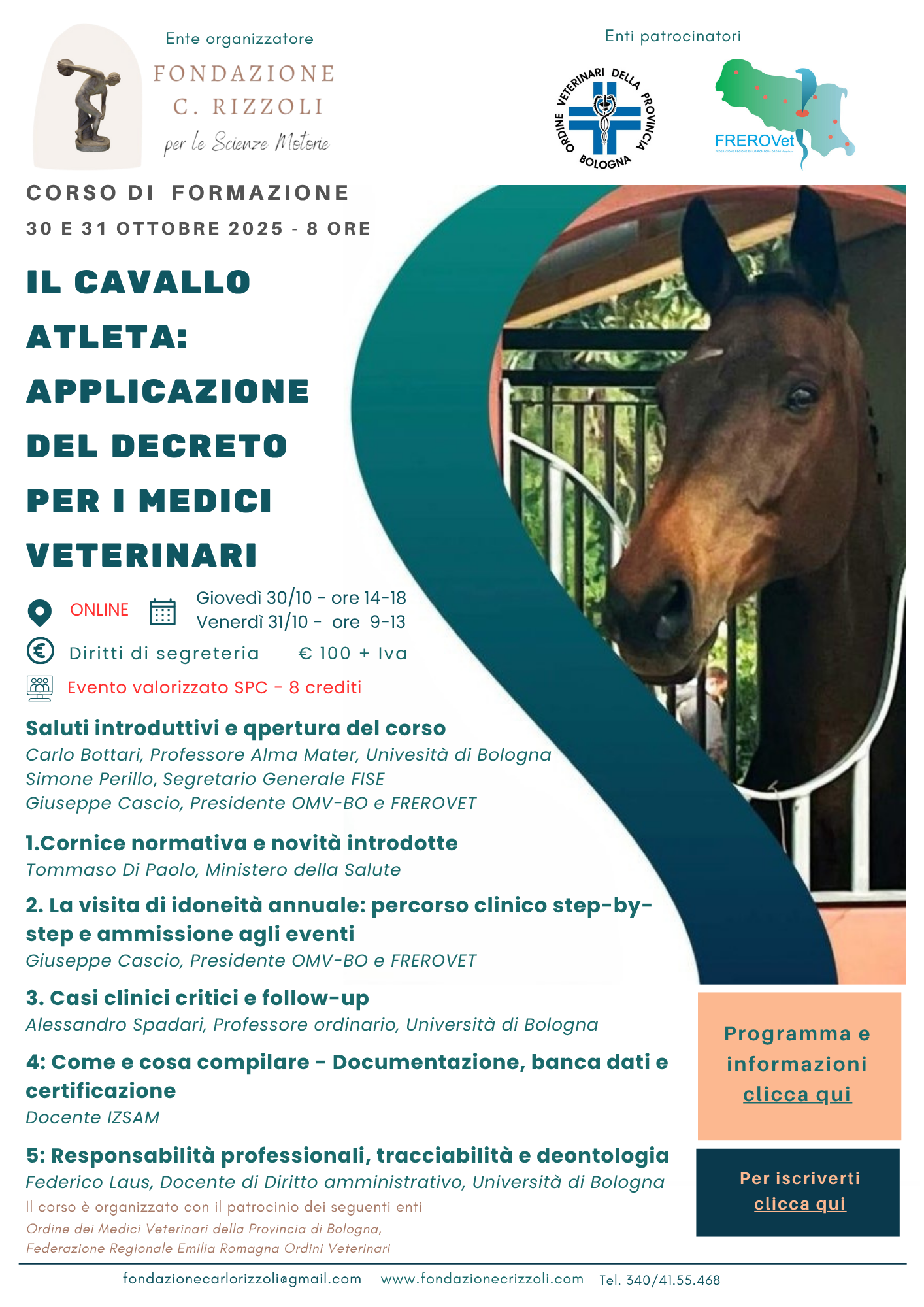 Il corso offre ai medici veterinari una preparazione completa sugli aspetti normativi, clinici e operativi connessi al nuovo decreto “cavallo atleta”. Il programma approfondisce il quadro legislativo, le definizioni e le responsabilità dei diversi soggetti coinvolti, illustrando le novità applicative e le ricadute pratiche nella gestione quotidiana. Ampio spazio è dedicato alla visita di idoneità annuale e alla pre-ammissione agli eventi, con esercitazioni pratiche e OSCE mirate alla standardizzazione dell’esame clinico, alla corretta documentazione e alla gestione delle situazioni borderline. I moduli finali trattano la compilazione digitale di schede e certificati, la tracciabilità dei dati, le responsabilità professionali e la comunicazione della mancata idoneità. L’obiettivo è promuovere competenza, uniformità e trasparenza, a tutela del benessere animale e della professionalità veterinaria.